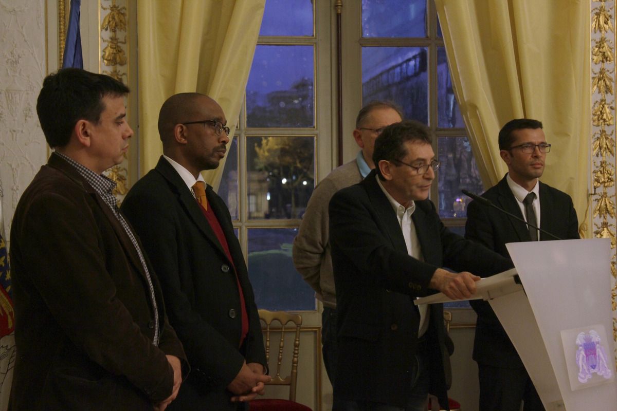 Sebastien Laborde, Karfa Sari Diallo, Patrick Serres au micro derriere Jean Pierre Lefevre et Marik Fetouh à la mairie de Bordeaux le 4 février 2016