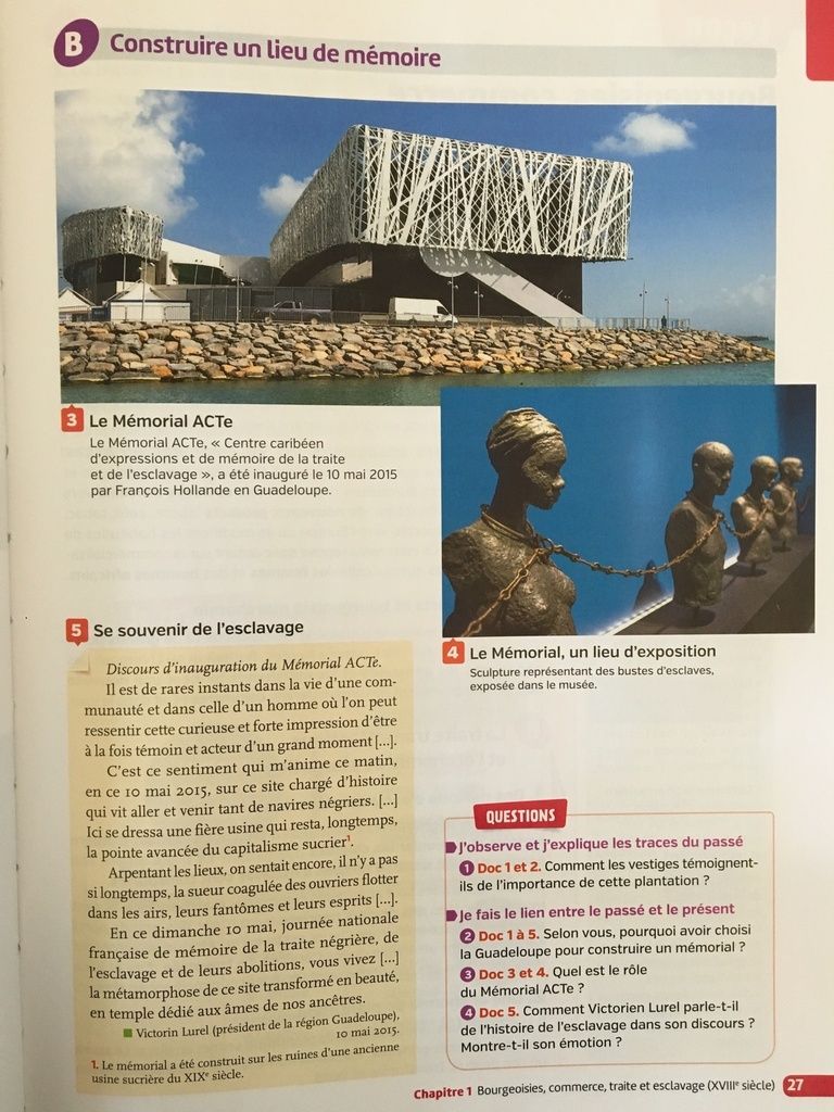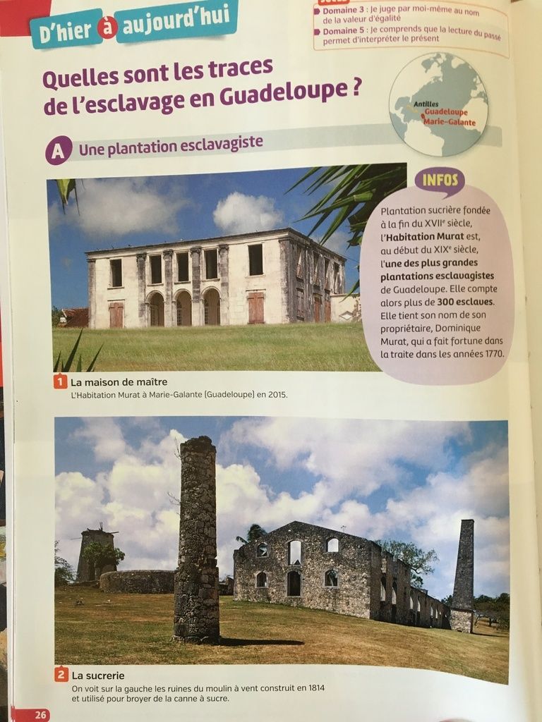 Les nouveaux programmes d'histoire des classe de 4ème viennent d'être publiés dans les manuels scolaires des éditions Nathan. Les ouvrages seront distribués à la rentrée prochaine. Dans le chapitre 1, "bourgeoisies, commerce, traite et esclavage", deux pages en vis-à-vis sont consacrées à la Guadeloupe. La première montre l'habitation Murat de Marie-Galante et rappelle qu'elle a accueilli jusqu'à 300 esclaves. L'autre page présente le MACTe, "un lieu de mémoire" pour "se souvenir de l'esclavage", à côté d'un quizz pédagogique. Le MACTe a couté cher (80 millions), mais il est déjà dans les livres d'histoire.