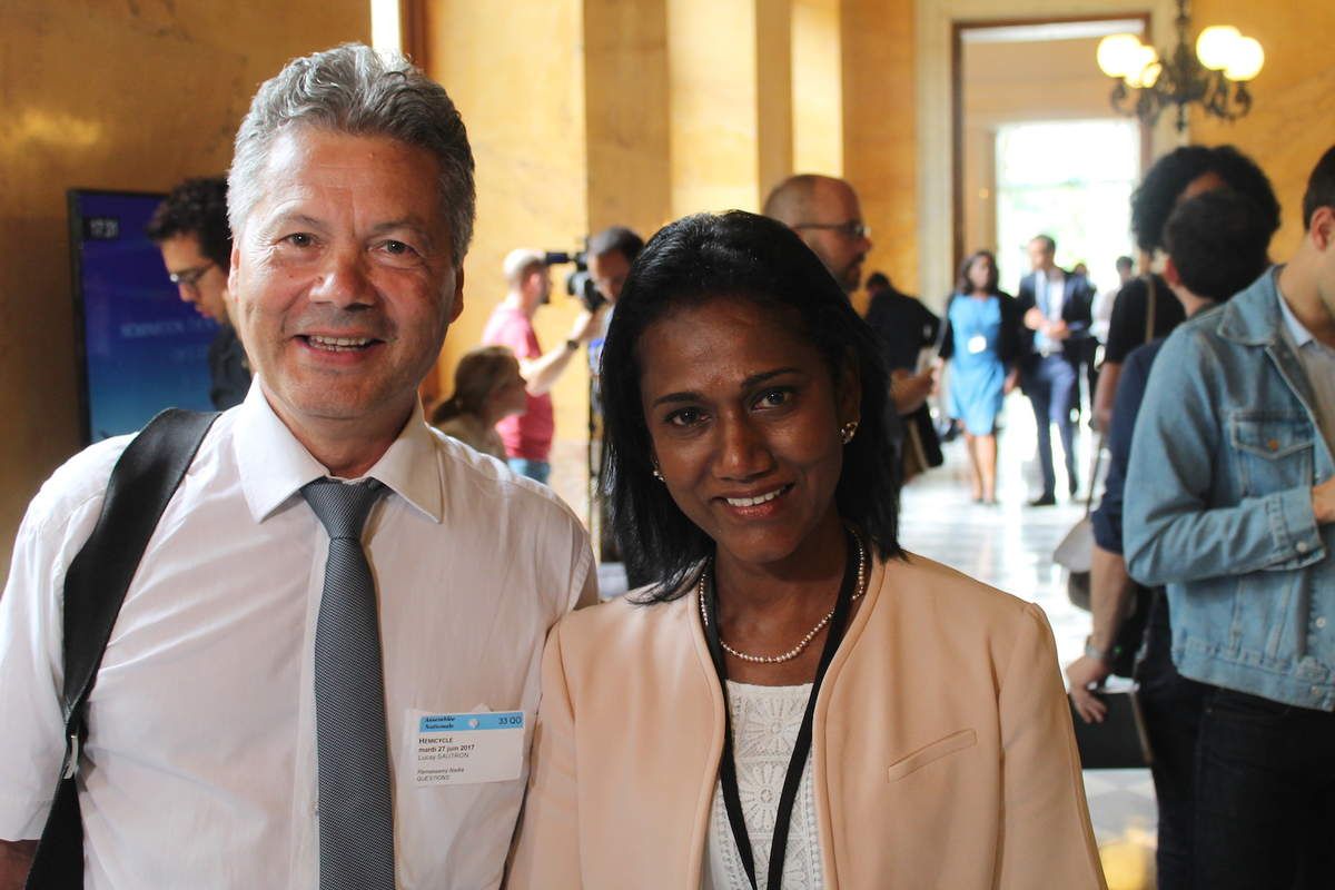 Tous les députés réunionnais ont pris part au vote lors d'une séance où les élus n'étaient pas disposés par groupe politique, mais par ordre alphabétique. Le scrutin a été long, a remarqué Jean-Hugues Rateront (en photo ci-contre avec son assistante parlementaire) qui siègera la semaine prochaine à l'extrême gauche de l'hémicycle avec les groupe des Insoumis. Pas question pour lui, mardi prochain, de voter la confiance au gouvernement d'Edouard Philippe. Même son de cloche avec Huguette Bello qui estime toutefois logique l'élection au perchoir de son ancien camarade de groupe: "Je connais bien François de Rugy depuis 1997. Il était dans notre groupe radical, citoyen et vert... Vous voyez le beau parcours qu'il a pu faire..."