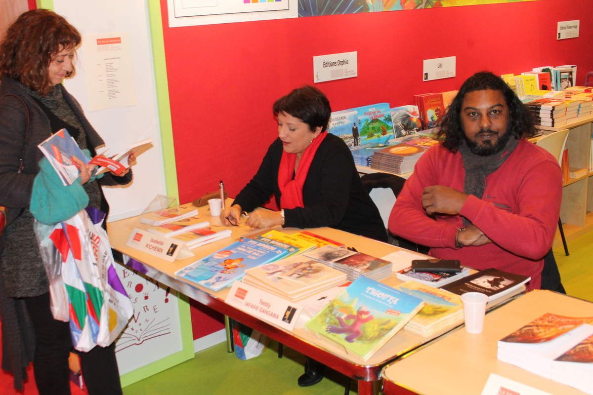 Pour autant les autres éditeurs, ceux qui proposent des livres sur l'histoire de la Réunion, de la fiction ou des livres jeunesse sont pas demeurées en restes... Ainsi, Isabelle Kichenin, toute nouvelle auteur est venu présenter son premier roman, "Gourmande". A ses côtés, se trouvait Teddy Iafaré Gangama, auteur jeunesse qui fréquente je le salon du livre Paris depuis cinq ans. Lui, il n'en démord pas : "Il faut venir et se montrer !"